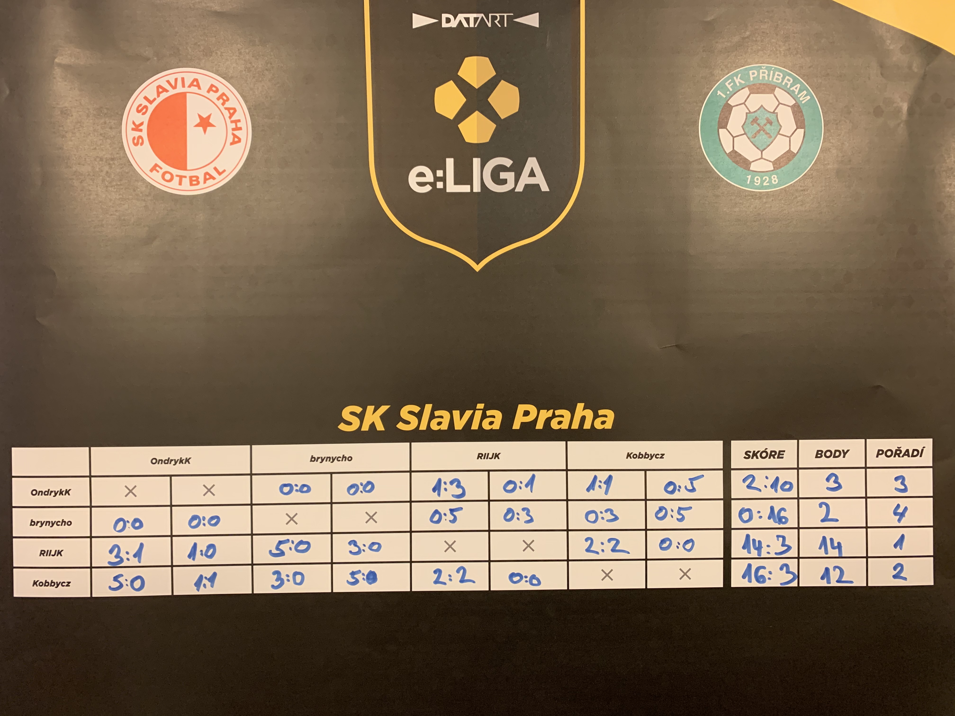 Four best players from Groupstage made it into the Semifinals for each of the 16 real-life football teams. The 4 players to battle it out for a spot in SK Slavia Praha were RIIJK, KobbyCZ, OndrykK and Brynycho. RIIJK proved to be the favorite and won the qualifier with 4 wins and 2 draws, being only 2 points ahead of KobbyCZ, his biggest rival. The other 2 players were far behind as you can see on the photo down below.